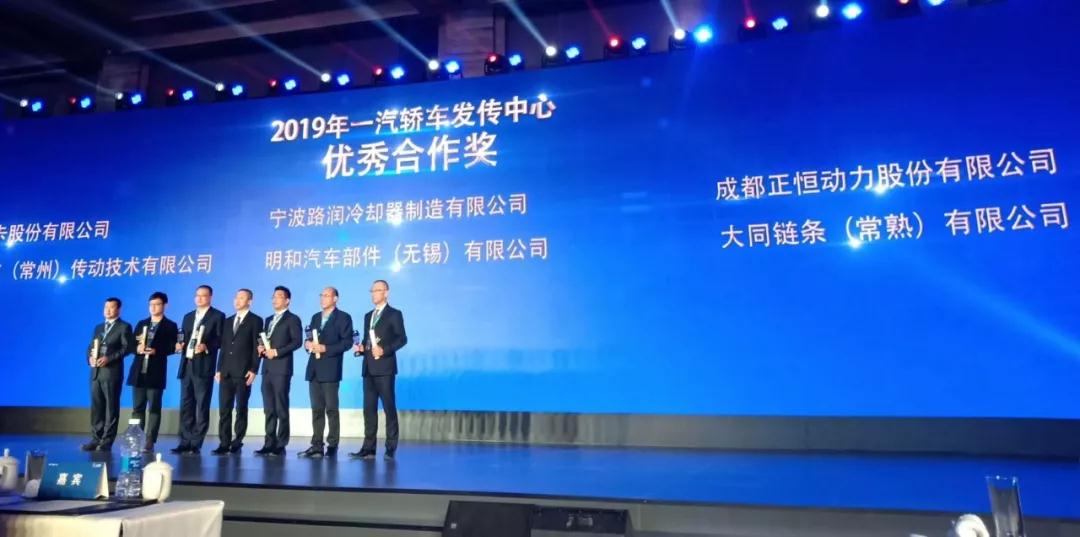 正恒動(dòng)力憑借高效的產(chǎn)品開發(fā)速度、優(yōu)質(zhì)穩(wěn)定的產(chǎn)品質(zhì)量榮獲了一汽轎車頒發(fā)的“2018年度優(yōu)秀合作獎(jiǎng)”,銷售副總楊林海先生上臺領(lǐng)獎(jiǎng)并接受了一汽轎車的表彰。