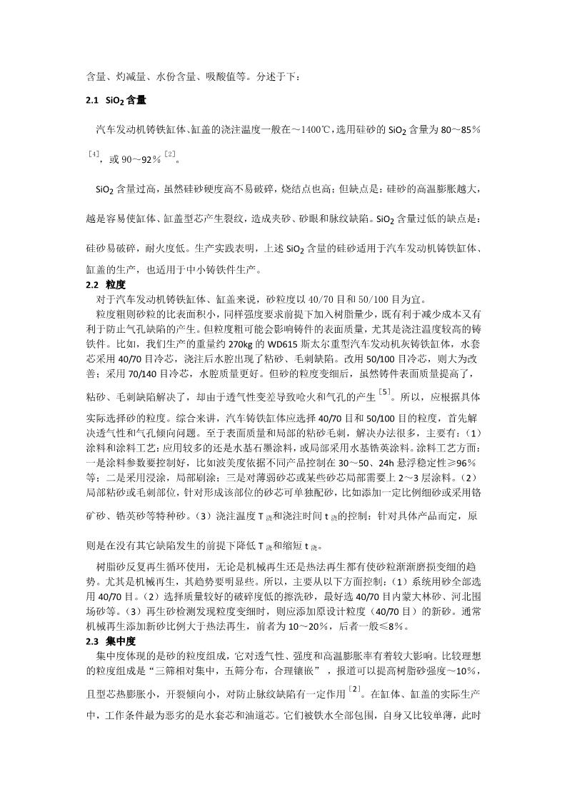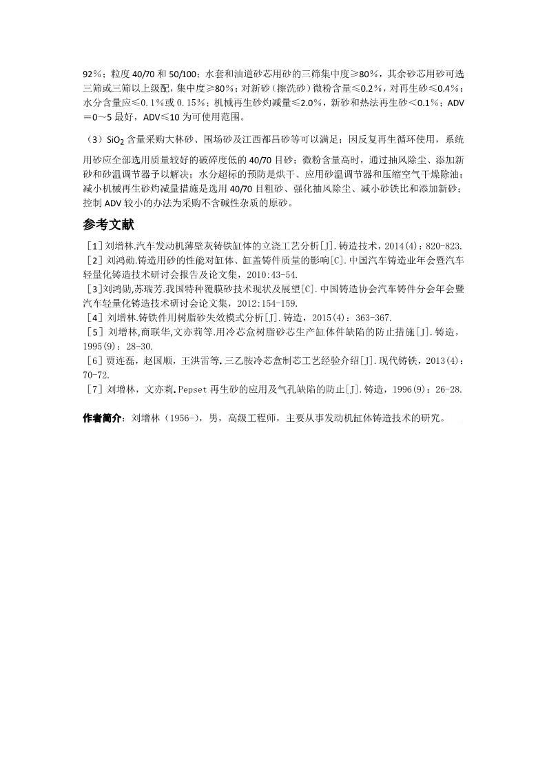 內(nèi)容摘要:汽車發(fā)動(dòng)機(jī)缸體鑄件生產(chǎn)中,無論是機(jī)械再生砂還是熱法再生砂,其質(zhì)量控制指標(biāo)為:SIO2含量80~85%或90~92%,熱法再生砂質(zhì)量甚至優(yōu)于新砂,可用于制作缸體鑄件的任何砂芯,機(jī)械再生砂因灼減量高僅用于制作缸體鑄件 的外型等未被鐵水全部包圍的砂芯。本文重點(diǎn)介紹在汽車發(fā)動(dòng)機(jī)鑄鐵缸體的生產(chǎn)中2種再生砂的質(zhì)量參數(shù)及其控制。