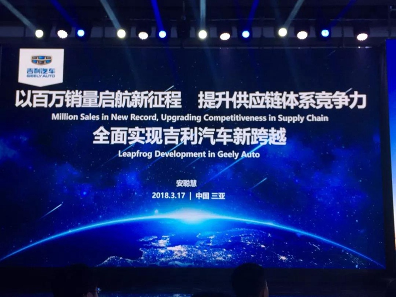 ???????吉利控股集團(tuán)董事長李書福先生發(fā)來VCR重要講話:2017年是吉利汽車發(fā)展史上濃墨重彩、具有里程碑意義的一年,63%的同比增速在全球首屈一指,在全球化布局等方面也取得了令人鼓舞的成果。2018年,是吉利汽車承前啟后、繼往開來的關(guān)鍵一年,吉利汽車和廣大供應(yīng)商是命運共同體,肩負(fù)著推動中國汽車品牌發(fā)展的歷史使命,期待與所有供應(yīng)商攜手奮進(jìn),為中國汽車工業(yè)的振興努力奮斗?!