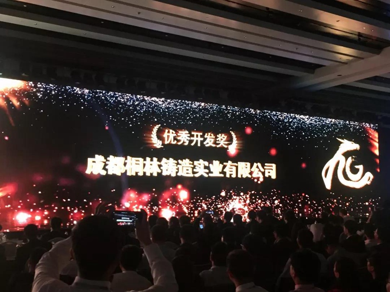 ?????? 正恒動力鑄造工廠——成都桐林鑄造實業(yè)有限公司憑借強(qiáng)大的研發(fā)能力、領(lǐng)先的專業(yè)技術(shù)在眾多的供應(yīng)商中脫穎而出,榮幸獲得2017年度“優(yōu)秀開發(fā)獎”,正恒股份CEO劉帆先生上臺接受吉利汽車的表彰。